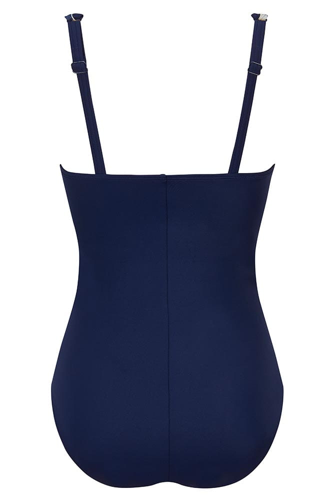 Der funktionelle Prothesen-Badeanzug Casoria von Amoena in klassischem Muster in Navy / Off-White ist ein zeitloser Favorit und verkörpert maritime Eleganz für entspannte, sonnige Stunden am Wasser. Das hochwertig recycelte Material überzeugt mit hoher Qualität und bietet einen UV-Schutz 50+, der sensible Hautpartien und empfindliches Narbengewebe zusätzlich schützt. Das hoch geschnittene Dekolleté kaschiert Hautunebenheiten und sorgt für Sicherheit ohne unerwünscht tiefe Einblicke zu gewähren. Wickeldesign und Schlüsselloch-Detail am Dekolleté geben dem schicken Einteiler einen Hauch von Exklusivität. Ein stützendes Innenbustier mit weichen Soft-Cups und beidseitigen Prothesentaschen fixiert Ihre Schwimmprothese sicher und diskret am Körper. Zusätzlichen seitlichen Halt für Ihre Epithese verspricht die bewährte Amoena Wave Seam Technologie am Unterbrustband. Ein integriertes Sichtfutter im Vorderteil verhindert Transparenz und sorgt für ein unbeschwertes Tragegefühl. Der edle Einteiler modelliert sanft Ihre Körperkontur, wirkt optisch verschlankend und unterstreicht eine feminine Silhouette. Elastische, längenverstellbare Träger erhöhen den Tragekomfort und ermöglichen eine individuell perfekte Passform. Der moderate Beinausschnitt garantiert angenehme Bewegungsfreiheit bei all Ihren Aktivitäten im und am Wasser.