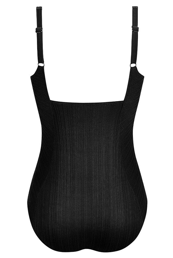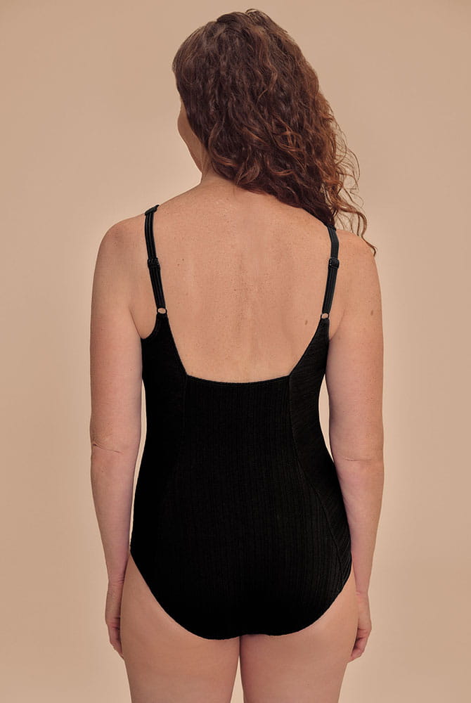 Die Treviso-Badekollektion von Amoena ist in ihrem edlen und doch modernen Design die optimale Ausstattung für Ihr Badevergnügen. Weiches Material mit schöner Rippen-Struktur sorgt für einen klassischen, zeitlosen Look und trägt sich angenehm weich auf der Haut. Ein leichter Shape-Effekt zeichnet sanft die Silhouette. Die Träger vorn sind breiter gestaltet und bieten bequemen Tragekomfort und angenehme Entlastung der Schulterpartie. Rückseitig sind die Träger verstellbar. Der Rückenausschnitt ist moderat. Ein stützendes Bustier mit beidseitig integrierten Prothesentaschen und weich gepolsterten Cups hält eine Brustprothese oder Teilprothese sicher verwahrt. Die Amoena Wave Seam ist eine Spezialverarbeitung am Unterbrustband des Innenbustiers und stützt die Amoena Schwimmprothese Aqua Wave seitlich zusätzlich. Blickdichtes Futter vorne und hinten verhindert Transparenz.