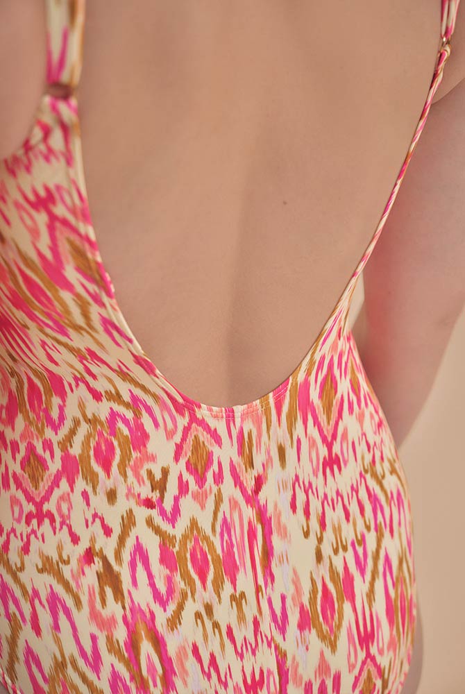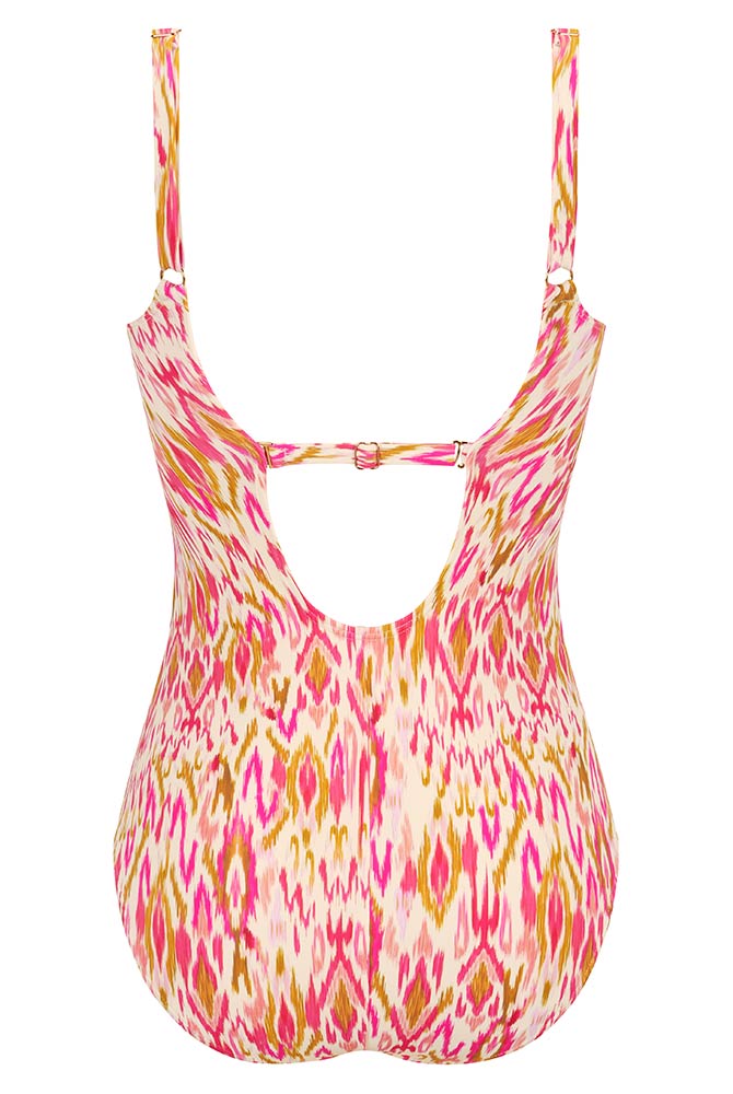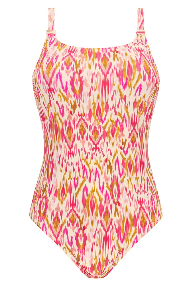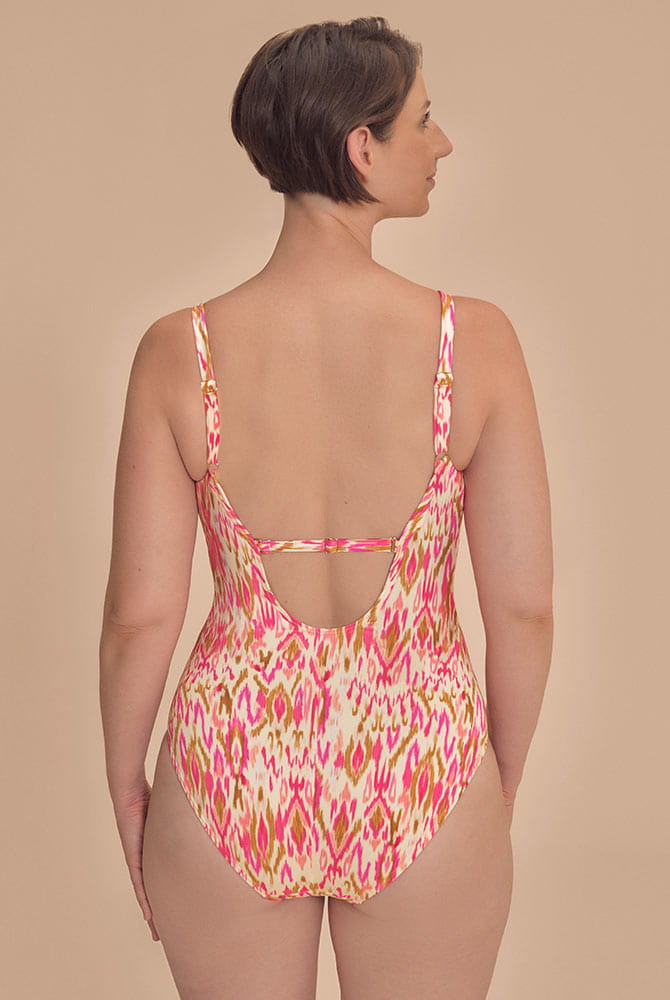 Mit Ikat-inspiriertem Print in femininen Pink- und Ertönen punktet Prothesen-Badeanzug Istria von Qualitätsmarke Amoena. Der zarte Musterprint bringt auch (noch) ungebräunte Haut wirkungsvoll zur Geltung und sorgt für Ihren stilvollen Auftritt an Pool und Strand. Ein stützendes Innenbustier mit Softcups und Prothesentaschen bietet Halt und Sicherheit und verwahrt diskret Ihre Schwimmprothese. Die innovative Amoena Wave Seam Technologie sorgt am Unterbrustband des Bustiers für zusätzliche Unterstützung. Ein eingearbeitetes Sichtfutter vorne und hinten verhindert Transparenz. Weich und elastisch schmiegt sich das hochwertige LYCRA® XTRA LIFE™ Material an die Haut und verspricht langanhaltende Passform und hohe Chlorresistenz. Der elegante Einteiler Istria mit seinem verführerisch tiefen Rückenausschnitt ist mit einem horizontalen und abnehmbaren Steg im Rücken ausgestattet. Ein exzellenter UV-Schutz 50+ schont sensible Haut und empfindliches Narbengewebe. Längenverstellbare Träger optimieren die individuelle Passform.