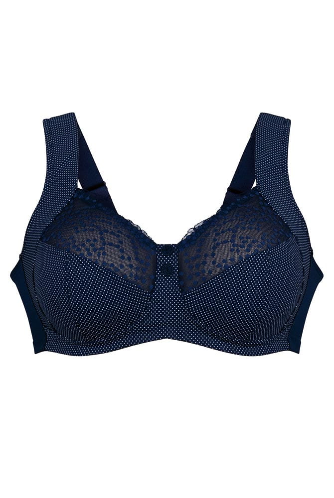 Romantisch verträumt mit hinreißenden Akzenten bezaubert der Entlastungs-BH Orely mit französischem Pünktchen-Charme. Perfekten Halt bis in Cup H garantiert die hochfunktionale Wirkware in den dreigeteilten unterfütterten Cups. Für hochwertigen Tragekomfort ist das Unterbrustband mit einem sanft geschwungenen Eck versehen, während die gepolsterten Träger sowie der Rücken aus Powertüll angenehm entlasten. Die verstellbaren Träger sind breit geschnitten und optimieren die Passform. Auch für große Größen ist Komfort BH Orely unbedingt empfehlenswert.